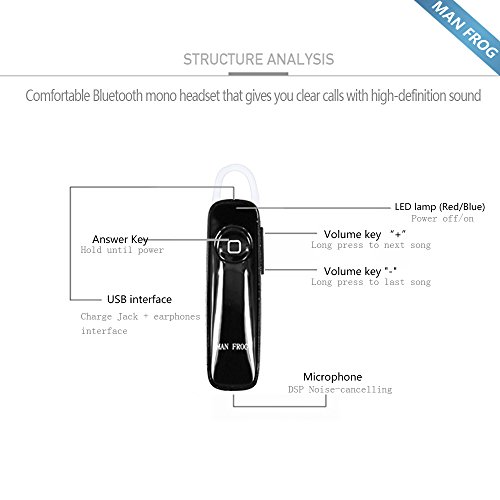 -. Feature : USA Brand Bluetooth Headphone, Super easy and fast paring with your smart Phone, PAD, Apple iPhone, Android Google Samsung Galaxy, Huawei, LG, Windows Phone Lumia, PC Laptop and other Bluetooth device; / Fits comfortably in either ear with a super soft gel ear tip, Noise-cancelling microphone, Multipoint technology, LED battery status indicator; / Deep Sleep mode extends battery life ( up to 72 hours standby time ), effective distance up to 30 feet; / Retail Packaging includes: Headset, Ear hook, USB Charging cable, Operating instructions, Case Color is Black; / Fully Charger the Bluetooth Headset before You Use it, use any cell phone socket ( 5V output, iPhone, Android, Windows ) to charger it. When you do the first time pairing with your phone, please press and hold the headset Answer/End button until Blue and Red lights were flashing alternately, choose and accept your MAN FROG Bluetooth headset model by pressing 'Yes' or 'OK' on the phone, they will automatically connect it from Second time.