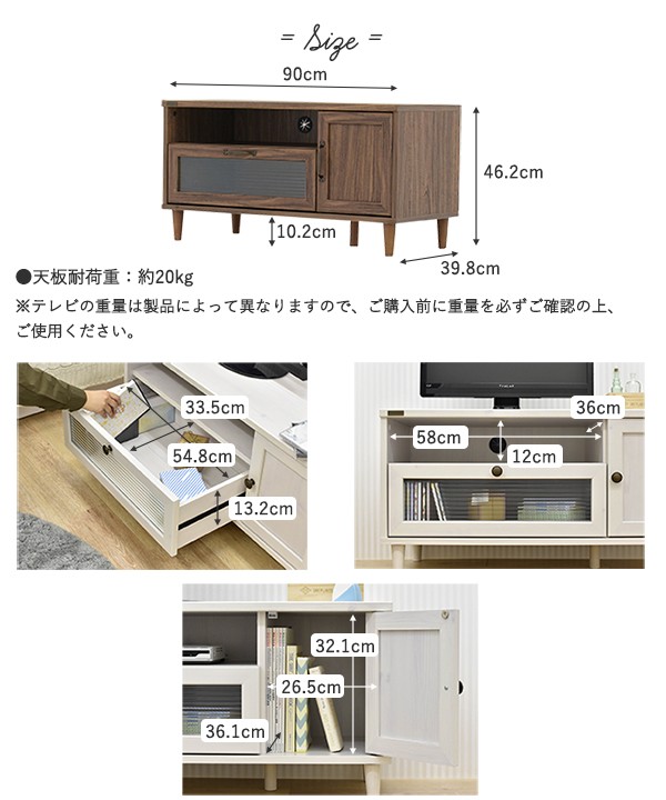 ■商品説明:波ガラスやアンティーク風の取っ手が女性らしく魅力的なリビング収納シリーズ「POWRY(ポーリー)」。定番のブラウンカラーは木目調で優しい雰囲気となっており、さまざまなテイストとコーディネイトしていただけます。収納したものをオシャレに隠せる波ガラスと、レトロな風合いの取っ手がどことなくアンティーク調の雰囲気を漂わせる収納家具です。90cm幅の少し小ぶりなサイズのテレビ台です。★耐荷重:[天板]20kg★コード穴:1個★組立時間:約45分/2人(*お客様組立商品になります。工具はお客様にてご用意いただいております。)※組立時間はあくまで目安となります。■サイズ・容量商品サイズ:W900×D398×H462mm商品重量:17kg内寸:[引き出し]W548×D335×H132mm(有効内寸:H155mm)[扉内]W265×D361×H321mm[オープン部]W580×D360×H120mm梱包サイズ:W1090×D440×H125mm梱包重量:18.5kg■規格[本体]プリント紙化粧板[脚]天然木[ガラス部]5mm厚波ガラス■キーワードテレビ台 おしゃれ コンパクト 幅90 POWRY ポーリー テレビラック ローボード TV台 AVラック ホワイト ブラウン リビング収納 PW46-90L