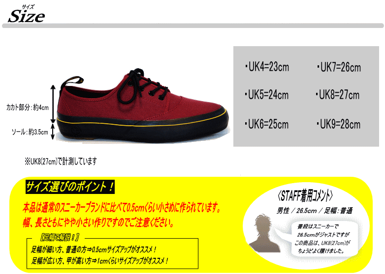 | サイズ | 作り⇒小さめ 【サイズ選びのポイント!】 足幅が細い方、普通の方⇒0.5cmくらいサイズアップがオススメ! 足幅が広い方、甲が高い方⇒1.0cmくらいサイズアップがオススメ! |