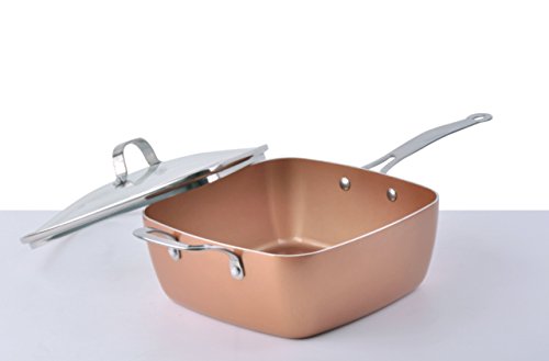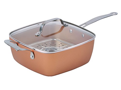 Unity-Frankford brings you our Cookmate Copper Pan System at an Affordable Price!Treat yourself to a new way to cook today. Kitchens are full of pots and pans, but there is one pan that can do it all! This Copper Pan System is a 9.5" x 9.5" x 4" deep square pan 4.5 quart capacity. This pan has a durable multi-layer construction! There is a copper ceramic interior coating over an Aluminum core with and induction bottom for even heating. This Pan comes with various accessories including: a tempered glass lid, deep fry basket, and a steam rack! This is the one of the best pans available and its versatility will make it one of your favorite tools in your kitchen!