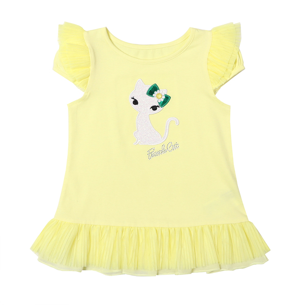 설명 옐로우 컬러 캡소매에 롱티셔츠 입니다. 소매와 밑단에 기계주름 샤 원단이 덧데어져 있어 러블리한 느낌을 주며, 화이트 고양이에 꽃모티그가 큐트함을 더했습니다. 쫄바지들과 코디하시기 좋습니다.