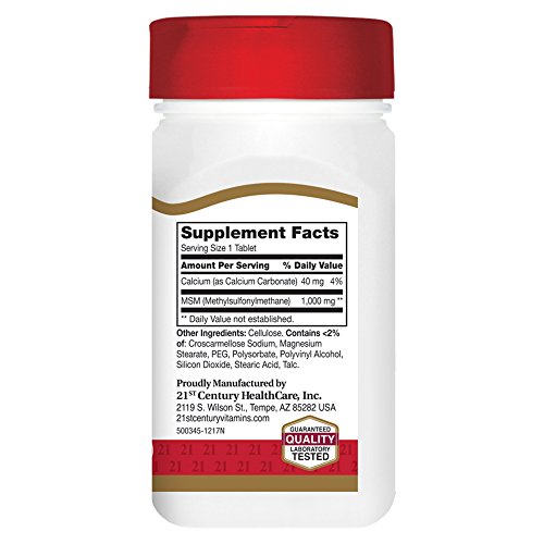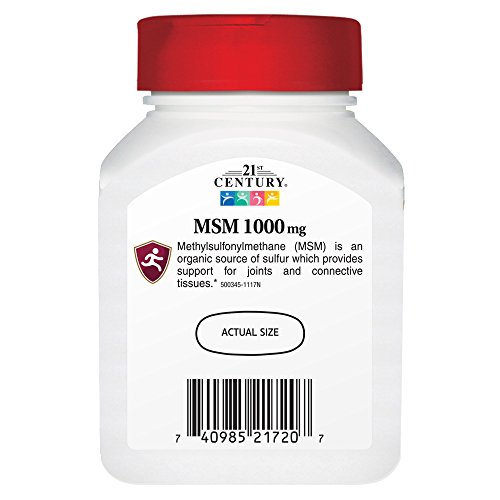 Methyl-Sulfonyl-Methane (MSM) is an organic sulfur unlike sulfur produced from an inorganic source such as methanol, a petroleum based product. MSM is biologically organic sulfur, a molecule found in food, plants, and every cell of the body. Organic sulfur is critical to the stabilization of the connective tissue matrix of cartilage, bones, tendons, and ligaments. Research has shown MSM is important for the synthesis of glycosaminoglycans and prevents certain enzymes from destroying healthy cartilage tissue.* Unconditionally guaranteed for purity, freshness and label potency. No Yeast, Preservatives or Artificial Flavors. 21st Century Vitamins and Supplements are manufactured in a cGMP facility under the strictest standards for product quality, including potency and purity. 21st Century prides itself on providing you with a great product at the best value. *This statement has not been evaluated by the Food and Drug Administration. This product is not intended to diagnose, treat, cure, or prevent any disease.Feature