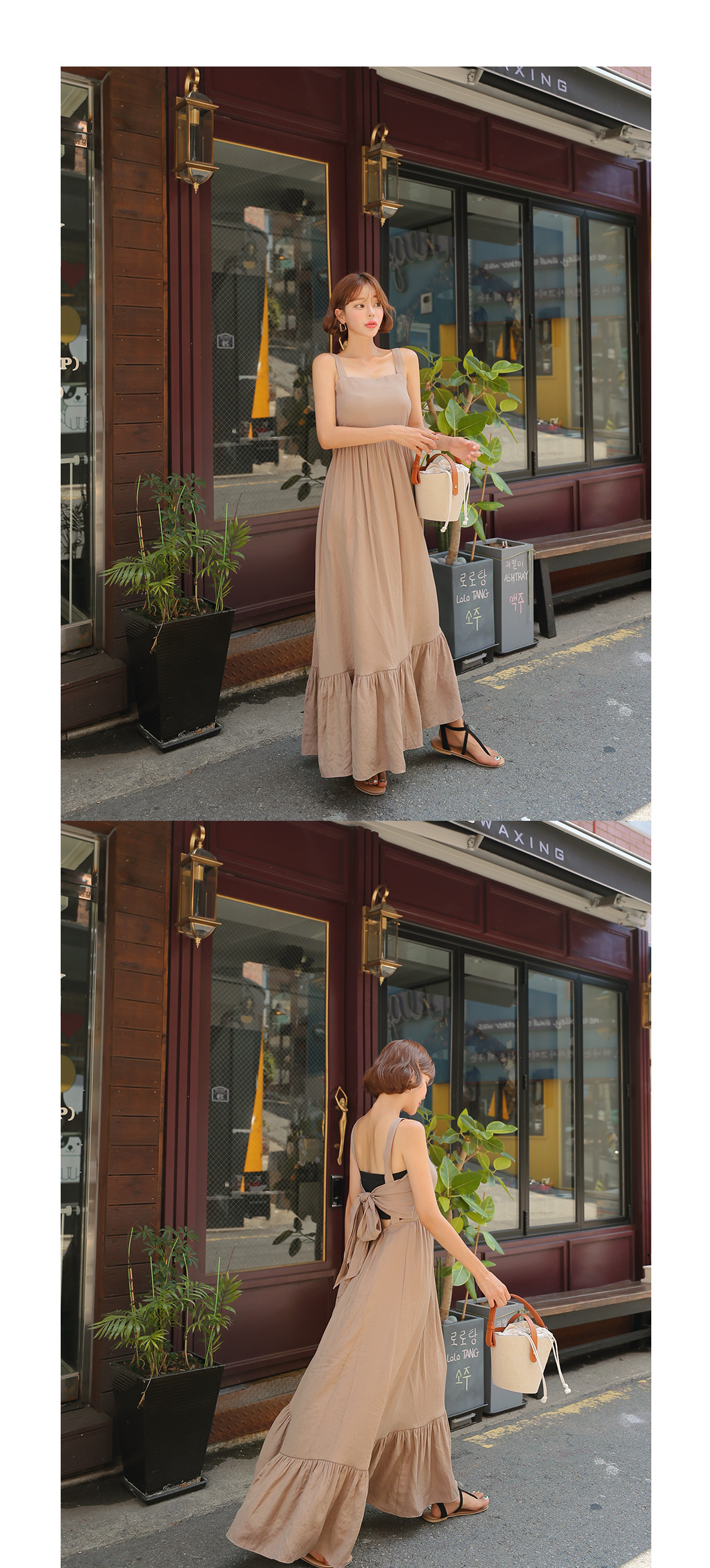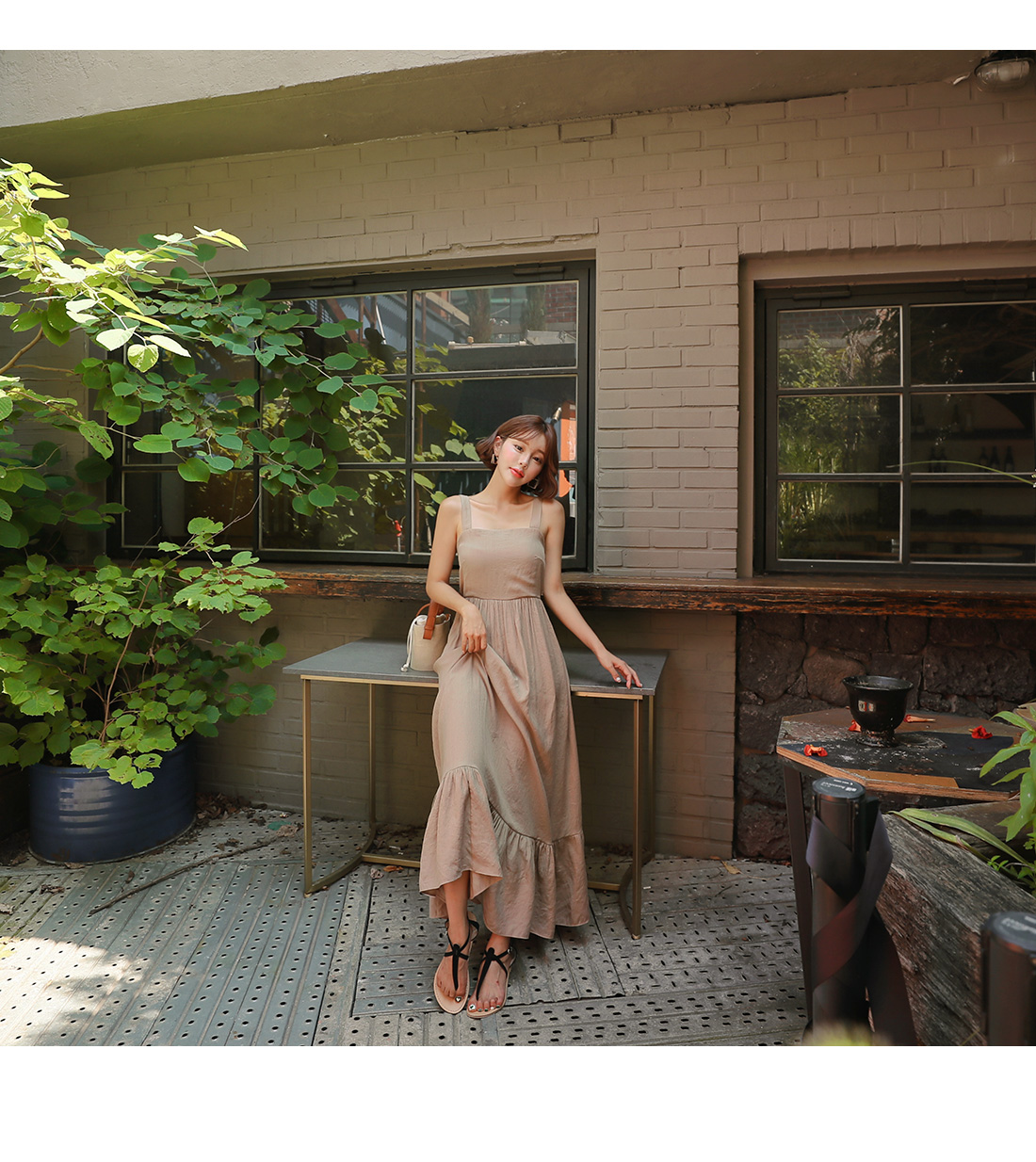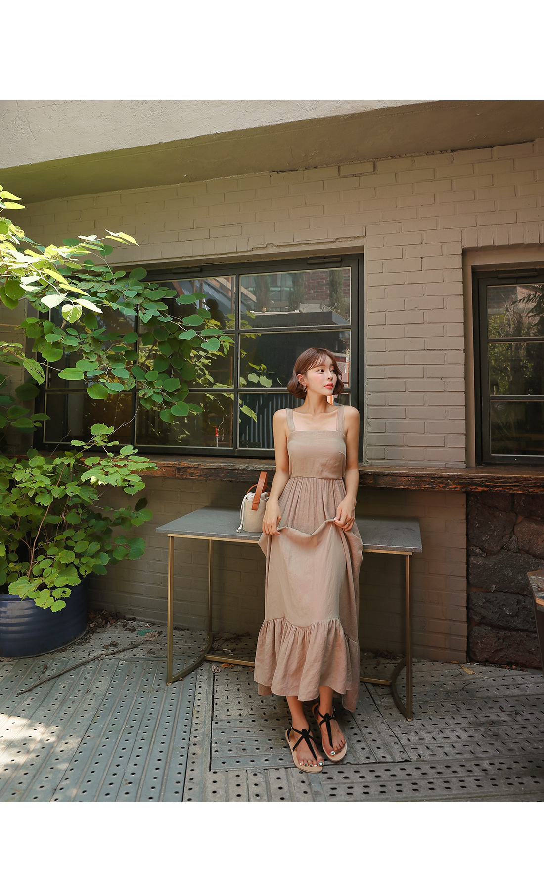 MD COMMENT여성스러운 스타일을 연출해 줄 롱원피스를 소개할게요.살짝 깊은 스퀘어 네크라인으로 디자인되어목선과 쇄골라인을 예쁘게 연출해주는 아이템인데요.양 사이드에 있는 스트랩으로 리본으로 묶어 연출해주시면은-근 섹시한 분위기와 트렌디한 무드를 연출해주구요.허리 반밴딩으로 안정감있게 착용가능하며편안한 착용감을 느낄수 있답니다.전체적으로 여유있는 핏감과 발목을 덮는 롱-한 기장감으로부담없이 즐기기 좋으며군살을 쏙- 숨겨줘 체형커버에 효과적이랍니다!밑단의 프릴 디테일을 주어 여성스러운 포인트를 한-껏 더연출해주었구요.가벼운 소재감으로 걸을 때마다 매력적인 실루엣이 연출되어데이트룩, 바캉스룩 등 포인트 주기 좋은 원피스 아이템으로 추천할게요!백라인의 스트랩으로 손쉽게 탈,착용 가능하답니다.COLOR/SIZE베이지,핑크,블랙FREEMODEL FITTING베이지/FREE