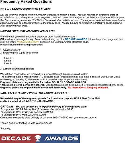 An engraved plate can be requested if ordered from DECADE AWARDS. Please verify item is SOLD BY DECADE AWARDS when checking out. Items ordered from other Sellers are not eligible to receive a courtesy plate from Decade Awards.