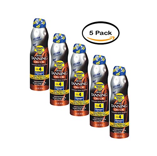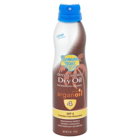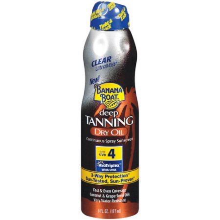 Studio : Banana Boat Publisher : Banana Boat Binding : Misc. Product Description A radiant tan begins with Banana Boat Ultra Mist Deep Tanning Dry Oil SPF 4 - One touch spray for quick, easy coverage! This tanning formula is non-greasy, lightweight and promotes a sun-kissed glow of long-lasting color*. Its formula moisturizes, with a blend of coconut, argan, grape seed, and olive oils, for silky soft skin. 0