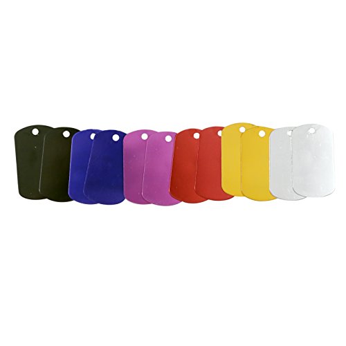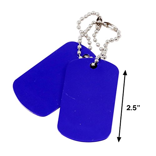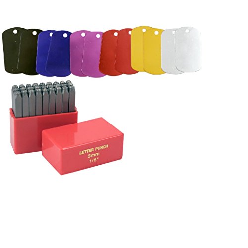 Dog tags come in red, orange, blue, purple, silver, and black (2 of each color). Each has a ball key chain loop, and are 2 x 1.13 ". Letter stamp has 27 pieces: A-Z uppercase. Letter stamp can also be used to stamp most metals, and can create jewelry and other metal crafts.