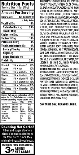 -. Feature : A sweet and salty crunchy blend of pretzels, real roasted peanuts and creamy peanut butter dipped in a rich milk chocolaty coating / Only 1g sugar and 3g net carbs per serving / Excellent source of protein & fiber / No added sugar. Great for a low carb lifestyle! / Essential vitamins and minerals
