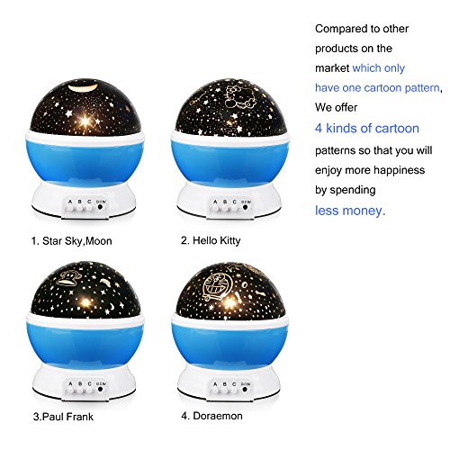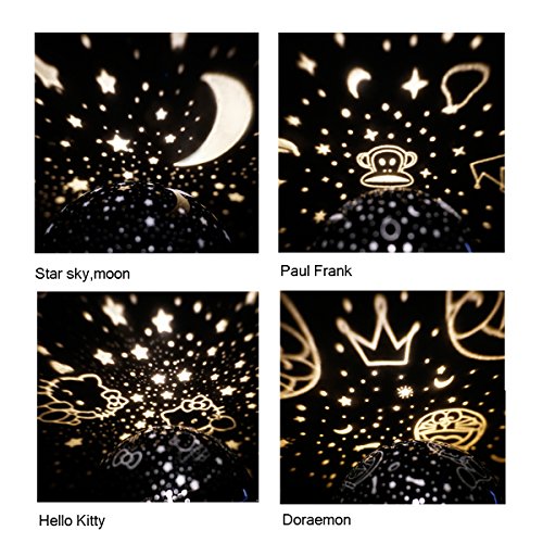 Compared to other products on the market which only have one cartoon pattern, we offer 4 kinds of cartoon pattern so that you will enjoy more happiness by spending less money.Features: 4 Patterns for the lampshade: moon star ;Doraemon ;Hellokitty ; paul frank