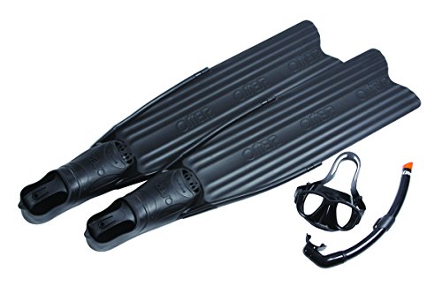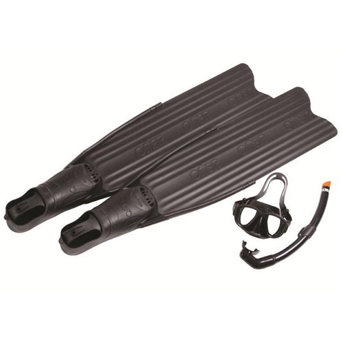 Freediving fins featuring a thermo rubber foot-pocket with an excellent quality/price ratio. The blades are produced in a low modular polypropylene, the angle between foot-pocket and blade being 17A Degree. Ita€s a powerful fin but easy to use, for beginners as well as skilled fishermen. Kit composed by black silicone Alien mask, Zoom snorkel and Eagleray fins. Everything in a nylon bag. See sizing chart below under the specification tab.Feature