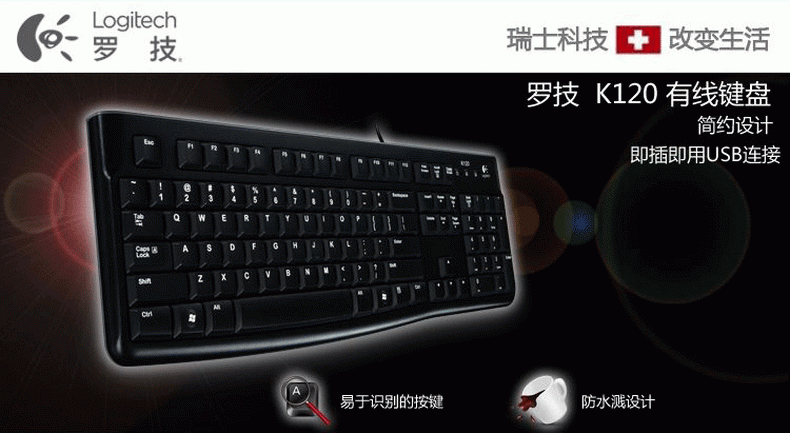 罗技依然为它设计了防水溅功能,在键盘底部设置有两个导流孔,当液体意外进入键盘时,液体可从键盘内导流孔自由流出,无需担心不小心泼溅出的液体会损坏设备。K120采用的是USB连接方式,可以插入台式机或笔记本使用,方便快捷。