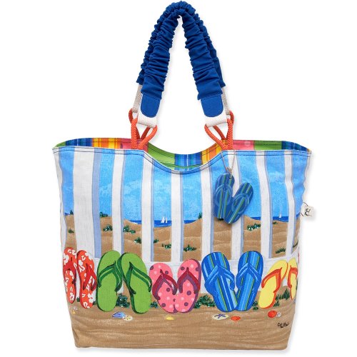 Product Description Size of bag:18.5 x 5 x 14, Handle drop: 12". Zip top closure. Artist: Paul Brent. Beautiful beach and flip flap painting with sparkling beads details in front. Double carrying handles with rope accent. Zip top closure with Paul Brent original zipper pull. Spacious interior is fully lined with white nylon. Interior wall zip pocket. Cell phone and sunglass pouches. 0