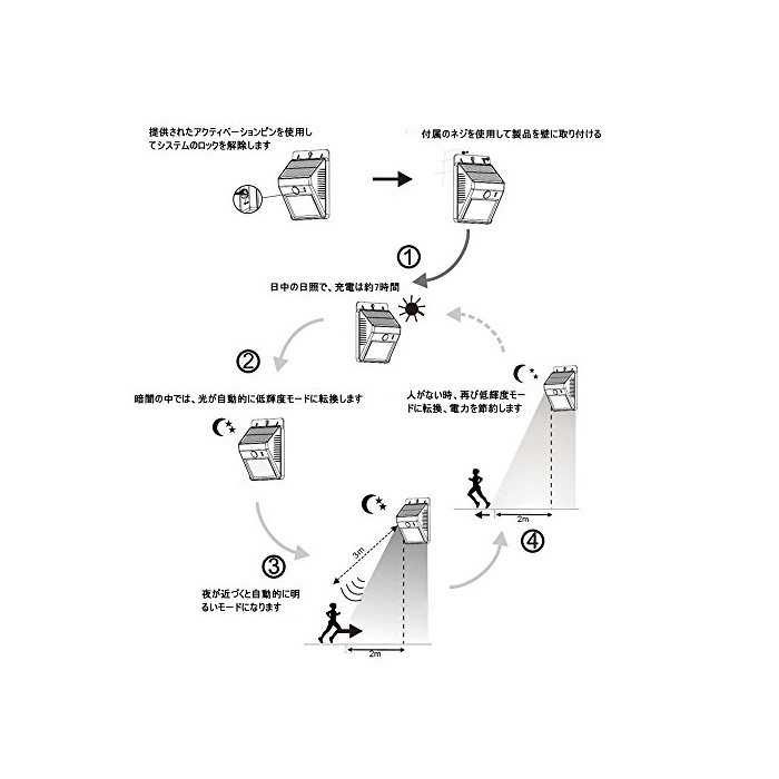 두 개의 점등 모드:오프 모드,세찬 광센서 모드.인감센서와 나이트 센서가 탑재되어 있습니다. 인감센서의 감도는 양호하고 오버인 액션을 하지 않아도 가까워지는 것만으로 자동적으로 상야등 모드부터 전등모드로 전환합니다.약20 초후상야등 모드로 되돌립니다.