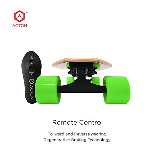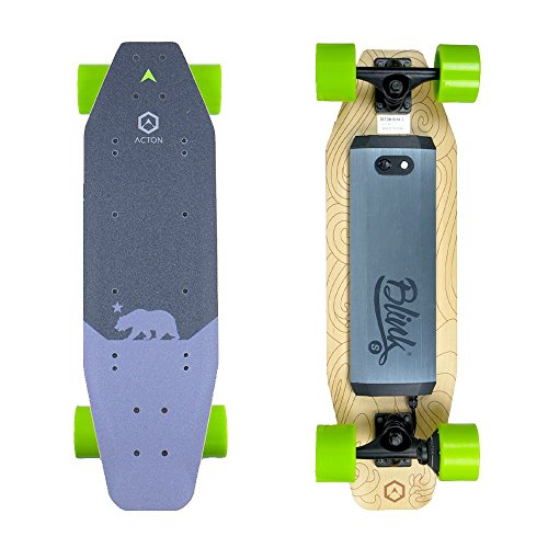 Powerful Battery-Powered Electric Skateboard - Perfect For Kids, Students, and Commuters! Our motorized lightweight skateboards are sturdy, strong and built to last! Not only that, but Acton BLINK boards come fully-equipped with LED light kits that guarantee our riders are visible to traffic and can see small rocks and other obstacles on the road. Safety and reliability are our highest priorities. We've heard from disappointed owners of our competitors' products that the batteries on their boards don't fully charge, and only last for a couple miles of cruising. Our top-of-the-line lithium ion batteries not only charge fully in just 2 hours, but under the right conditions will guarantee up to 5 miles of riding fun on a single charge! Perfect for a trip to the store, getting around town or riding to school in a way that's sure to turn heads! The perfect gift for holidays and birthdays, your kit will arrive with a board, a portable battery charger, and a simple-to-use remote control that can change the board's speed and direction at the press of a button. Weighing only 7.7 pounds, the BLINK Lite is the lightest and most portable on the market...while cruising at speeds up to 10 MPH! The Blink S can carry anyone up to 180 pounds. Download the smartphone app when you get your board, and you'll be able to track your routes, log your miles, and record your adventures! We've designed the Acton BLINK Lite electric skateboard to be an all-in-one-solution for your every cruising need...so if you were waiting for the perfect time to experience the action of Acton, the time is now!Feature