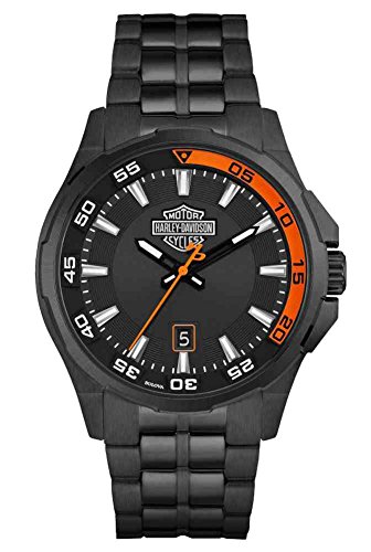 -. Feature : Harley-Davidson Watches / Black dial with orange quarter-turn detail / Bar & Shield® logo at 12 o'clock, the day calendar at the 6-hour marker / Signature H-D® counterweight / Double-press fold-over clasp and safety lock.