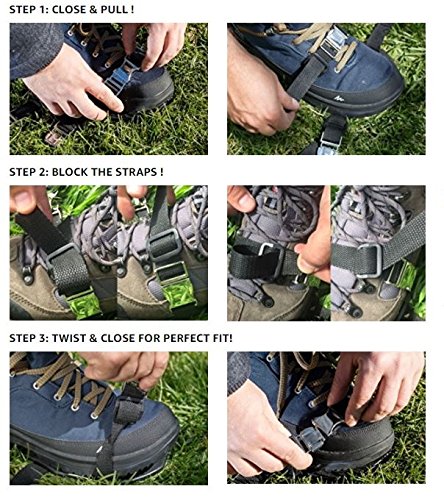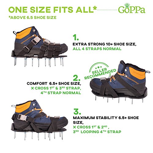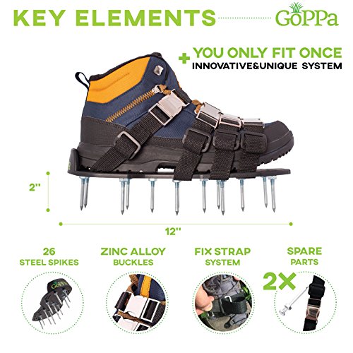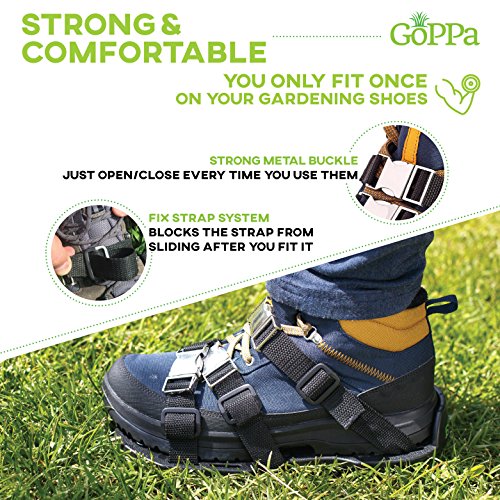 INNOVATIVE PRODUCT – GoPPa are the only aerator shoes you ONLY FIT ONCE! This unique and innovative 2 BUCKLES EACH STRAP SYSTEM takes you only 5-10 min to fit them on your gardening shoes FOREVER. For BEST RESULTS use them on moderate dry soil and with boots.