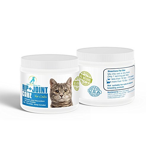 -. Binding : Misc. -. Brand : Ace Pet Health -. EAN : 0646437874229 -. Feature : JOINT RELIEF FOR YOUR CAT from daily use of Ace Pet Health's Hip and Joint support powder. ALL NATURAL PRODUCT - no bulking up that happens with cheaper imitations. / CONTAINS GLUCOSAMINE AND CHONDROTIN that strengthen and rebuild cartilage to support joint movement. MSM acts as an anti-inflammatory and is used in many Hip and joint products. THIS IS ALL STANDARD in competitor products. / BUT ACE PET HEALTH'S PRODUCT CONTAINS MUCH MORE 1. ORGANIC TUMERIC super anti-inflammatory product from ancient Eastern civilizations, that is a causing a storm in the natural remedies space for humans and pets 2. KONA BERRY FROM HAWAI which is a SUPER ANTIOXIDANT and offers INFLAMATTORY RELIEF. 3. ORGANIC CORAL CALCIUM that offers 74 NATURAL EARTH MINERALS / EASY TO ADMINISTER, just sP.R.Inkle on wet or dry food. No odor, no taste. No chasing your cat to administer tablets or hiding the tablet in his/her food / ORDER NOW, you're protected by a 60-day "No Problem" guarantee - 100% risk free! -. Label : Ace Pet Health -. Manufacturer : Ace Pet Health -. NumberOfItems : 1 -. PackageQuantity : 1 -. ProductGroup : Pet Products -. ProductTypeName : PET_SUPPLIES -. Publisher : Ace Pet Health -. Size : 6 oz -. Studio : Ace Pet Health -. Title : Organic Hip & Joint Support Powder for Cats - Glucosamine - MSM - Chondroitin - Kona Berry and Organic Tumeric for anti-inflammation - 6oz powder -. UPC : 646437874229