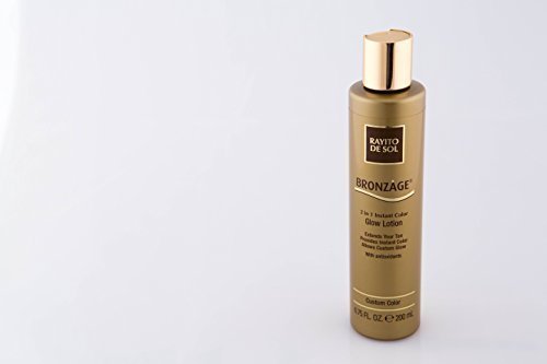 Rayito de Sol Bronzage 2-in-1 Instant Color Glow Lotion extends your tan, provides instant color, and allows custom glow with antioxidants.Rayito de Sol Bronzage 2-in-1 Instant Color Glow Lotion delivers individual flawless color while gradually creating a fabulous natural looking glow. Apply when you need instant color and after you wash off the color the gradual glow ingredient has started working to give you long lasting, custom glow. With daily application for 3 days, this rich lotion helps extend your tan. Enriched with antioxidants and moisturizers.