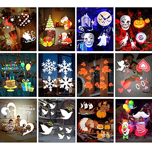 - ❤【12 Holiday Colorful Slides 】12 Patterns: 3 for Christmas; 2 for Halloween; 1 for Thanksgiving Day; 1 for Valentine's Day; 1 for Mother's Day; 1 for April Fool's Day; 1 for Birthday; 1 for Maple leaves; 1 for Doves. the colorful led projector as decorative lights with different scene patterns specially designed for Festival and Holiday and Party