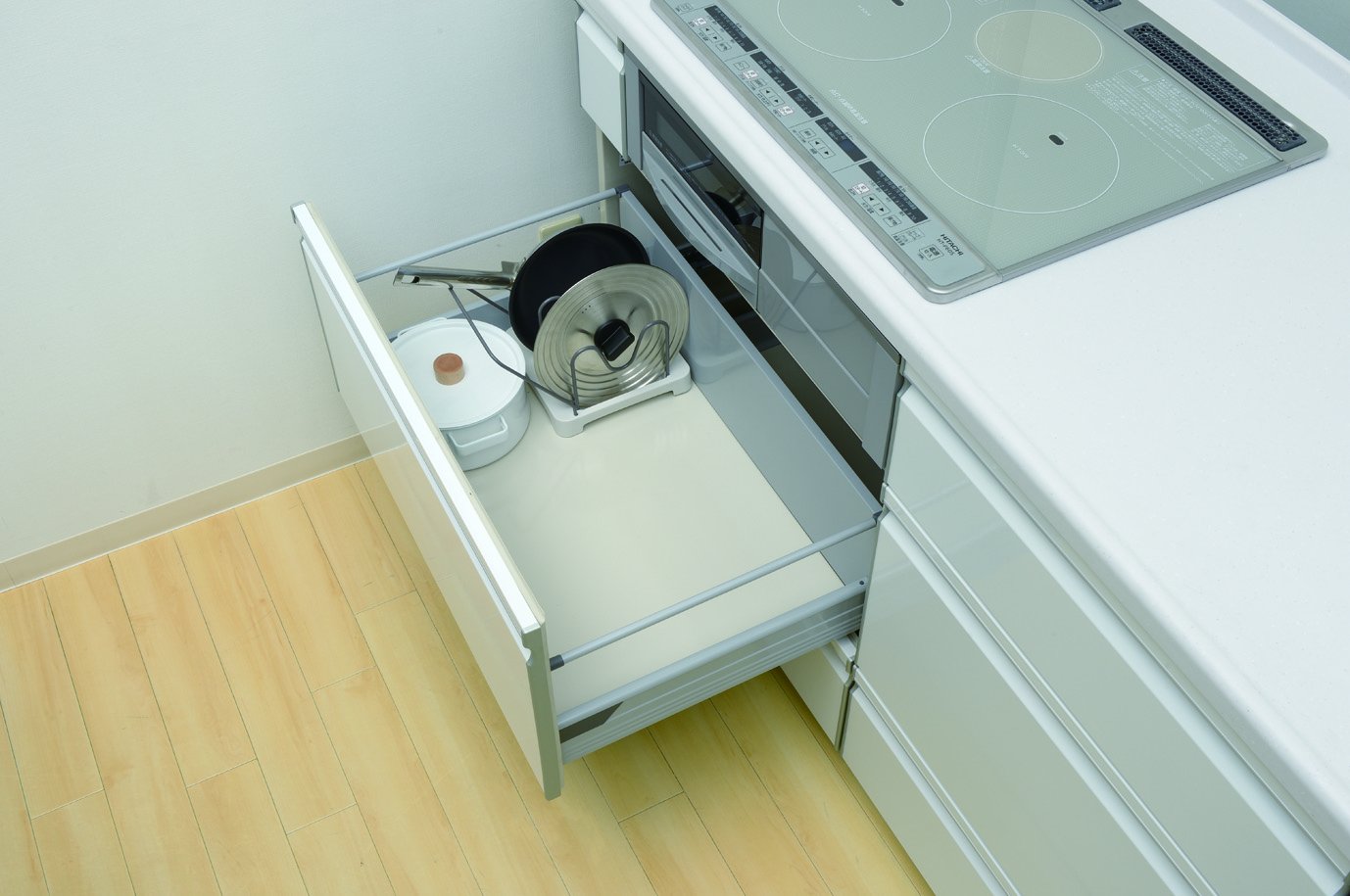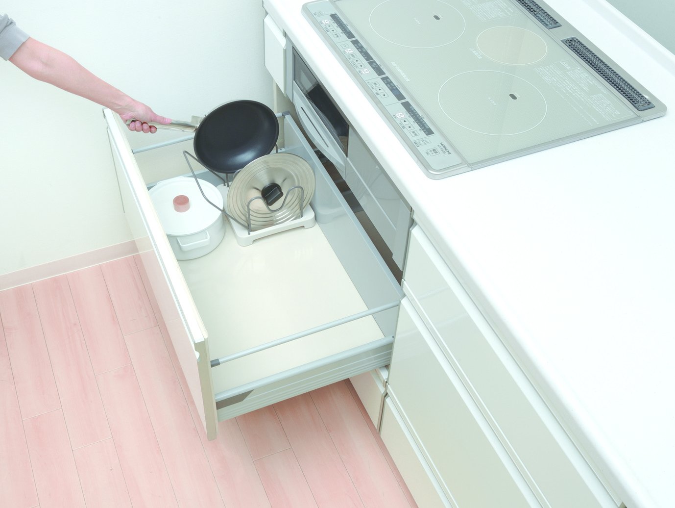 ● Pull-out type system Cleanliness of the kitchen ● Inside drawers Dedicated pan pot stands that can store large pots and frying pans in a drawer.
