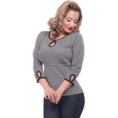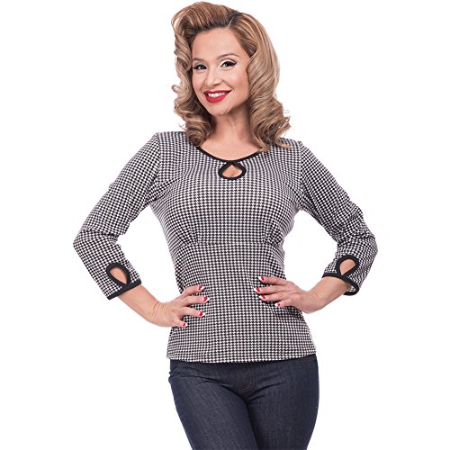 Studio : Steady Clothing Publisher : Steady Clothing Binding : Apparel Product Description Houndstooth Keyhole Top Women's Ivory/Black By Steady Clothing. Charm your way into any heart with Steady's Houndstooth Keyhole Top! This top features a center teardrop cutout and two teardrop cutouts on each 3/4 sleeve. Each cutout is made in a contrast black piping against the houndstooth print. Pair it with your favorite Steady high waist skirts and pants! Made in the USA. 75% Polyester, 23% Rayon, 3% Spandex. 0