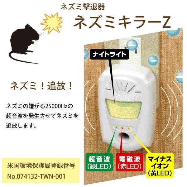 家庭用コンセントに差し込むだけで簡単です。イヌやネコに害がありません。もちろん人間にも無害です。最大60坪の範囲からネズミを駆除できます。 |