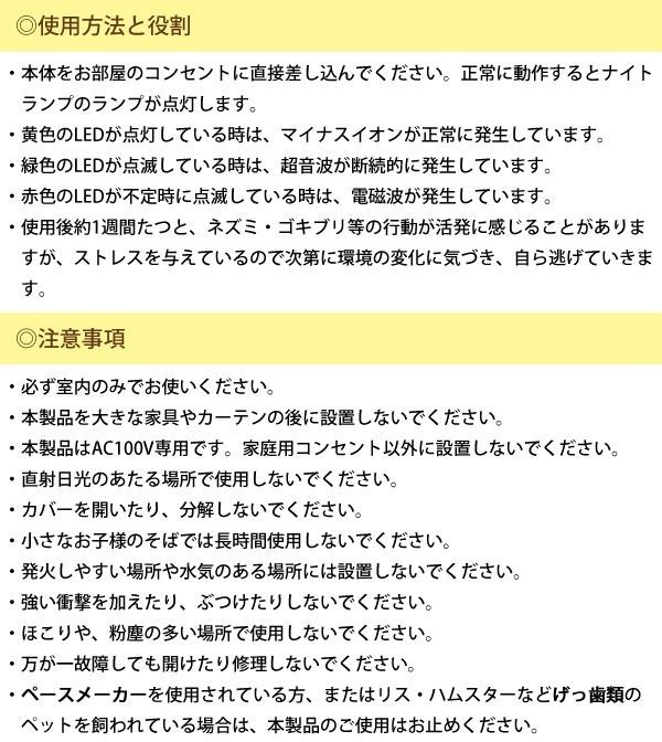 | 家庭用コンセントに差し込むだけで簡単です。イヌやネコに害がありません。もちろん人間にも無害です。最大60坪の範囲からネズミを駆除できます。 |