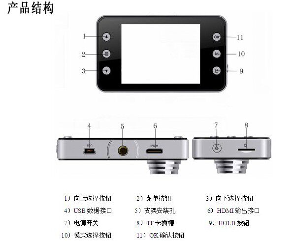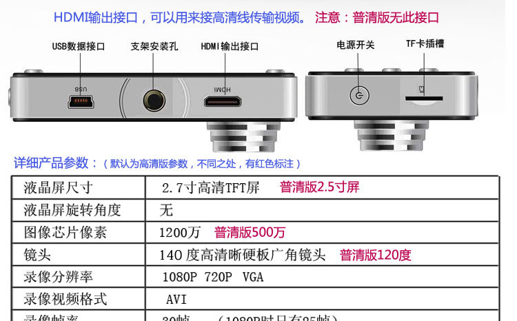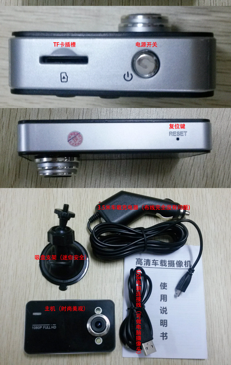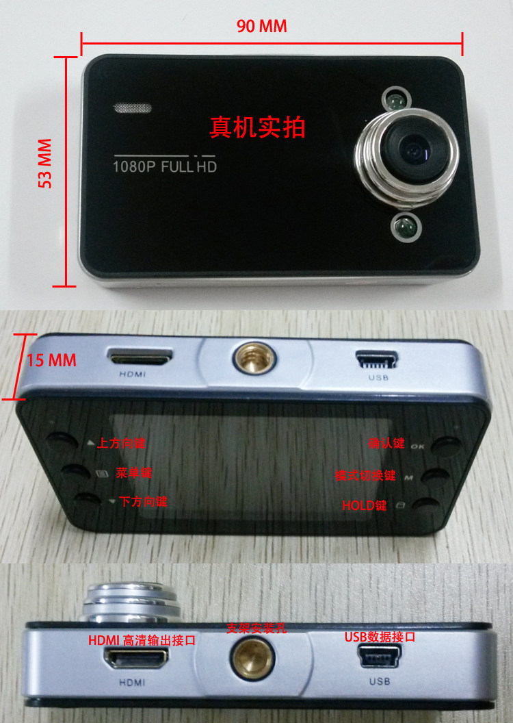 Description 100% brand new and high quality; Chipset Manufacturer: Novatek Color video recording with sound Photo taking Video recording with high resolution 140°wide angle lens Two bright LED lights for dark Environment and night use Motion detect function and cycle recording 4X Digital zoom 2.5 LCD Screen for video/photo display File protect function, when the File protect button is pressed when recording, the file can’t be deleted from the DVR. Support TF/Micro SD card up to 32GB (NOT INCLUDED) Specification LCD Screen Size: 2.5LTPS File Format: AVI Video Resolution:1920*1080/1440*1080/1280*720/848*480/640*480/320*240 Color Effects: Standard Continuous Loop Video: Seamless looping video, do not drain seconds Truck Switch Machine: Support auto ignition boot, turn off shutdown Motion Detection Function: Support Date of hours: Support Camera Mode: 5 million Photo Format: JPEG Memory card: TF(up to 32GB)(NOT INCLUDED) Microphone: Support Built-in stereo: Support Infrared night vision: Support Video Format: PAL / NTSC Current Frequency: 50HZ/60HZ USB Function: 1:USB-Disk 2:the PC-Camera Power Interface: 5V 800mA Battery: Built-in 600mAh USB Interface: Mini USB Dimension of Camera: 8.9 x 5.1 x 2.2 cm | |