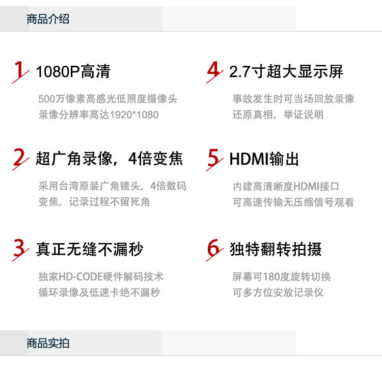 ![]() ![]() ![]() ![]() ![]() ![]() ![]() ![]() ![]() ![]() ![]() ![]() ![]() ![]() ![]() ![]() ![]() ![]() ![]() ![]() ![]() ![]() ![]() ![]() ![]() ![]() ![]() Description 100% brand new and high quality; Chipset Manufacturer: Novatek Color video recording with sound Photo taking Video recording with high resolution 140°wide angle lens Two bright LED lights for dark Environment and night use Motion detect function and cycle recording 4X Digital zoom 2.5 LCD Screen for video/photo display File protect function, when the File protect button is pressed when recording, the file can’t be deleted from the DVR. Support TF/Micro SD card up to 32GB (NOT INCLUDED) Specification LCD Screen Size: 2.5LTPS File Format: AVI Video Resolution:1920*1080(1080FHD) 1440*1080(1080P) 1280*720(720P)848*480(WVGA) 640*480(VGA) 320*240(QVGA) Color Effects: Standard Continuous Loop Video: Seamless looping video, do not drain seconds Truck Switch Machine: Support auto ignition boot, turn off shutdown Motion Detection Function: Support Date of hours: Support Camera Mode: 5 million Photo Format: JPEG Memory card: TF(up to 32GB)(NOT INCLUDED) Microphone: Support Built-in stereo: Support Infrared night vision: Support Video Format: PAL / NTSC Current Frequency: 50HZ/60HZ USB Function: 1:USB-Disk 2:the PC-Camera Power Interface: 5V 800mA Battery: Built-in 300mAh USB Interface: Mini USB Dimension of Camera: 8.9 x 5.1 x 2.2 cm Package 1 x XC35 Car Camera 1 x USB Cable 1 x Car Charger 1 x Car Mount 1x User Manual |