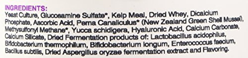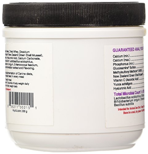 - Feature : Formulated for the active dog with Green Lipped Mussels / 1 Billion Colony Forming Units per Gram / Glucosamine Sulfate is a natural supplement that soothes the symptoms of hip dysplasia and arthritis while regenerating damage in the joints / Chondroitin prevents stress injuries to joints, aids in repair of damaged connective tissue, keeps cartilage tissue hydrated to cushion impact stress / Yucca relieves swelling, pain and stiffness associated with osteoarthritis