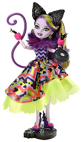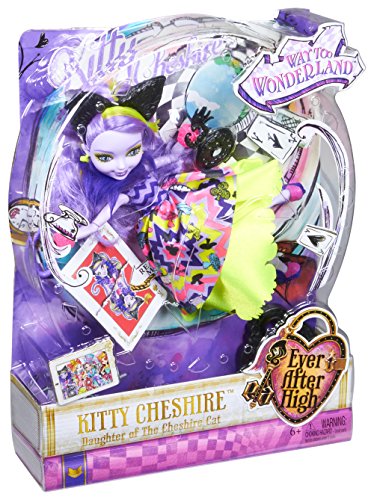 Shut the storybooks you thought you knew because at Ever After High, you can Choose Your Own Ever After! For these teenage sons and daughters of the most famous fairytales ever, every day can turn into an epic day. In the epic Netflix Original Series, “Way Too Wonderland,” Raven Queen, daughter of the Evil Queen, tries to magically reverse her mother’s curse on Wonderland and accidentally transports herself and her friends to Wonderland High. As Kitty Cheshire, Madeline Hatter, Apple White and Lizzie Hearts fall down the rabbit hole, their outfits transform into spellbinding dresses with wonderlandful charm. Kitty Cheshire doll, daughter of the Cheshire Cat from Alice’s Adventures in Wonderland, is the cat’s meow with her cat’s tail and wearing a dress with bold neon, beautiful pastels and a playing card-inspired print on the asymmetrical layered skirt. A colorful yellow hairstreak and oversized black headband with exaggerated cat’s ears are “just right” for Wonderland. Hexquisite detail, spelltacular shoes, a fableous faux fur collar and cuffs and a timely black pocket watch (that opens!) complete her charming look. Use the doll stand to capture the posable doll in a magical moment. Also comes with a doll hairbrush and bookmark with hexclusive content. Collect all of the Ever After High characters for Wonderland-iful fun (each sold separately)! Includes Kitty Cheshire doll wearing fashion and accessories, pocket watch, doll stand, doll hairbrush and bookmark. Doll cannot stand alone. Colors and decorations may vary.Feature