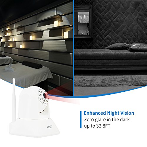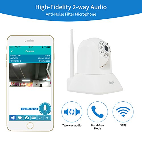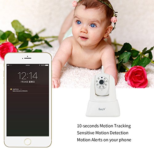 -. Feature : ★PLUG & PLAY & COMPATIBILITY: One Key WiFi Configuration makes setup quicker and easier. Wi-Fi setup via iphone or Android smartphone using the EasyN App, Seamlessly Stream Video and Two Way Audio Directly to Your phone, Tablet or Windows PC, Support Onvif. Micro SD card (Built-in Micro SD Slot, Max 128 GB supported, SD card is not included) for recording, storing and reviewing. / ★CAPTURE EVERY DETAIL IN BRILLIANT CLARITY: Real time camera or motion activated camera is expert in snapshotting moving objects. You can remotely control the camera via using the App to view your room from any angle you desired. Wide viewing angle with horizontal 355 degree pan and vertical 120 degree tilt. Records in 1920*1080 Mega Pixels to capture crystal clear images / ★TWO WAY AUDIO & MOTION DETECTION: Responsive and advanced microphone with a built-in anti-noise filter for a clear 2-way Audio experience. Automatically detect moving objects and alarm push to your smart phone via E-mail, App and FTP. / ★EXCELLENT NIGHT VISION: Intelligent IR-Cut switch and Digital Zoom camera provide a stunning clear and high quality vision through 8pcs infrared red light even in complete darkness, night vision up to 32.8 FT in pitch dark. Easyn camera provides the protection you need and act as a deterrent against crimes like theft, burglaries, and vandalism. / ★WORRY FREE PURCHASE and CHARITY: Backed by a 18-month 100% satisfaction guarantee and 30-Day "Risk-Free" Money-Back Guarantee. With your help, We donate a portion of proceeds to poverty-stricken students. Please Note: This is a 2.4ghz supported camera and it does not support 5ghz networks and check Instructional video and user manual in technical specification before use.1