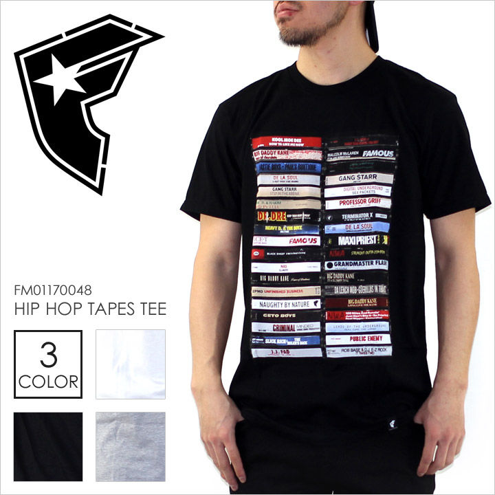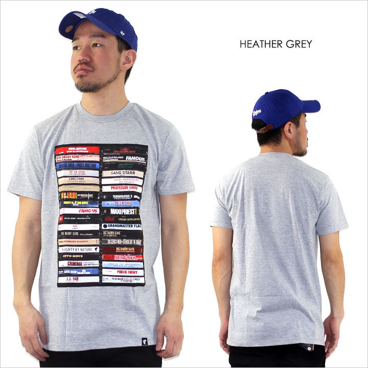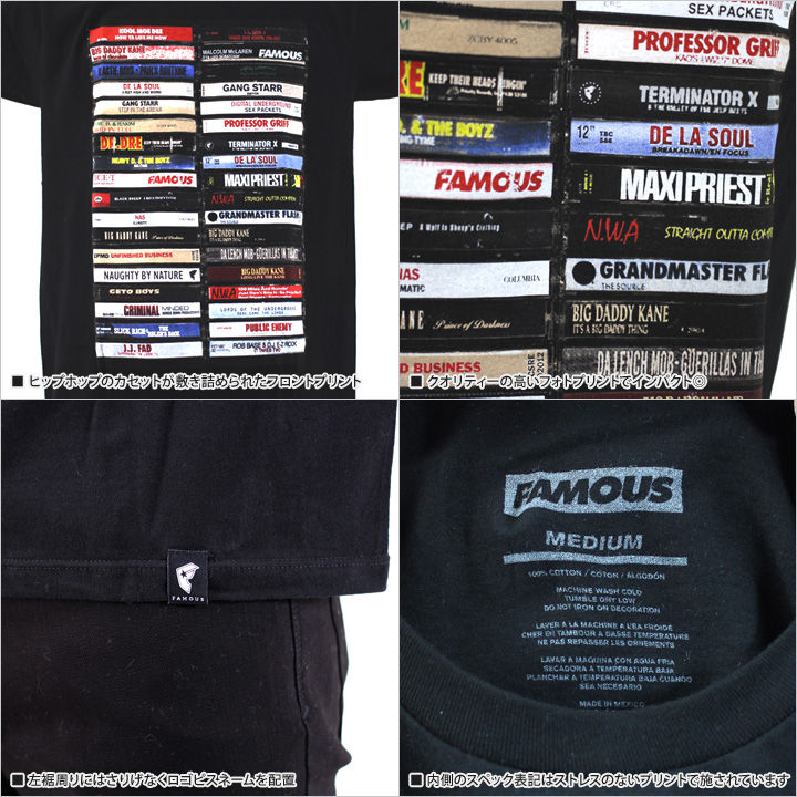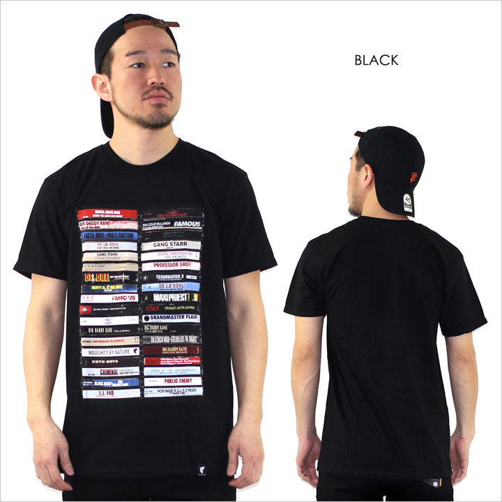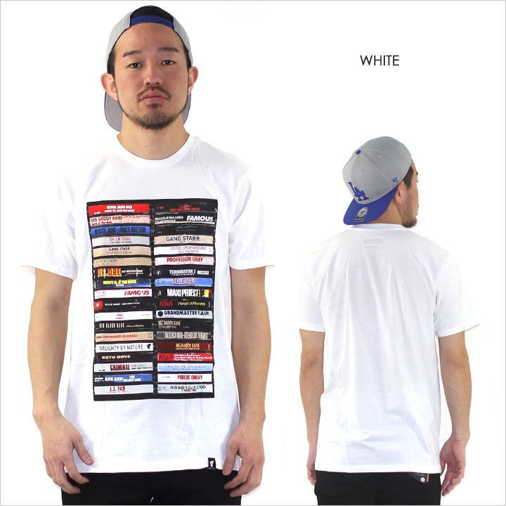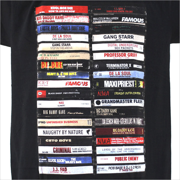 分かる人には分かるクラシックなカセットテープを敷き詰めたフロントプリントが好印象のTシャツ。