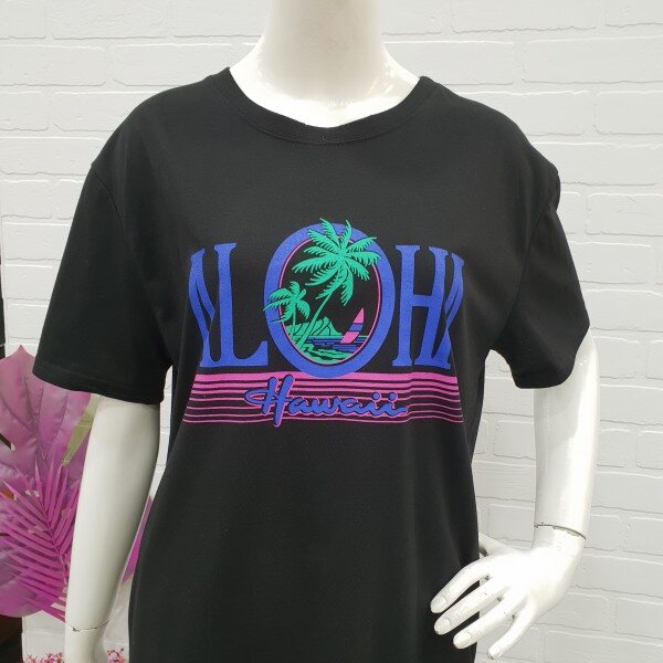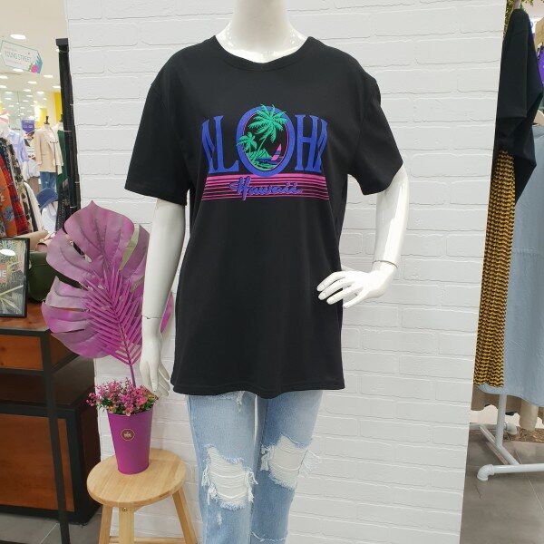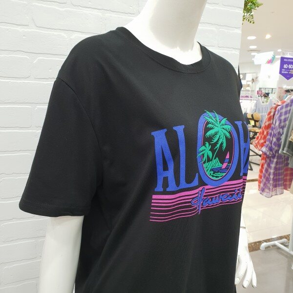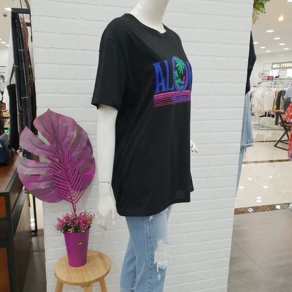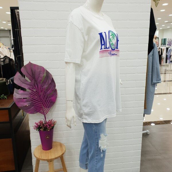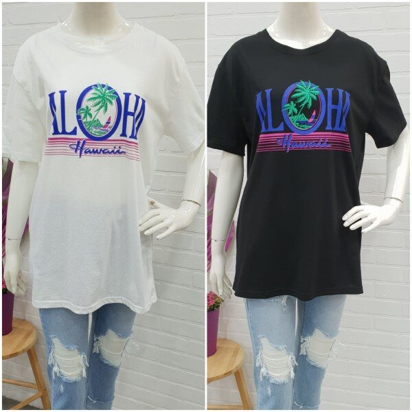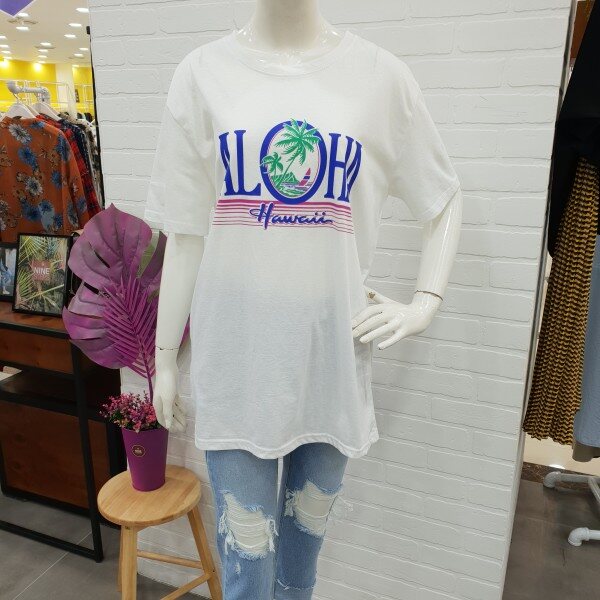 박시핏롱티예요.알로하 프린트가 시원해 보이는 편한 기본티죠.롱기장감으로 편하게 입기 좋아요.