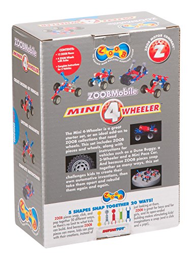 -. Binding : Toy -. Brand : ZOOB -. EAN : 0885699355118 -. Feature : 12 ZOOB pieces on wheels / High quality rubber tires are notched to work like gears / A great introduction to ZOOB and ZOOBMobile Car SetsA great introduction to ZOOB and ZOOBMobile Car Sets / Includes ZOOB pieces in special colors designed for building cars, 4 wheels with tires that can work like gears and an instruction guide / Recommended for children 6 years of age and older -. IsAdultProduct : 0 -. ItemPartNumber : GG9012 -. Label : Zoob -. Manufacturer : Zoob -. Model : 0Z12050 -. MPN : GG9012 -. PackageQuantity : 1 -. PartNumber : GG9012 -. ProductGroup : Toy -. ProductTypeName : TOYS_AND_GAMES -. Publisher : Zoob -. SKU : 12050C -. Studio : Zoob -. Title : ZOOBMobile Mini 4 Wheeler -. UPC : 635694120507 -. Warranty : N