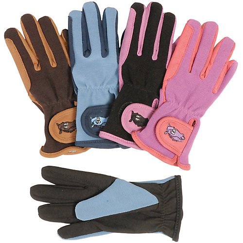 Studio : JT International Publisher : JT International Binding : Misc. Product Description Tough-1(R) Children's Pony Gloves From the original Equi-grip, these child sized gloves offer king-size protection. Tough(R)-1 Pony Gloves are built with a synthetic leather palm and fingers, for unparalleled feel and long wear. A stretchy Spandex back allows excellent airflow and accommodates hand motion for performance and comfort, and the Quick-grip hook and loop closure secures fast for a snug fit. Adorned with an embroidered horse head in a matching tone. These attractive colors are exclusively ours. Product Features: Superior comfort and performance Sized for a perfect fit Durable Quick grip closure Item Specifications: Faux leather palm/fingers Spandex Material: Synthetic leather, Spandex Sizing: 6-8 10-12 *The sizing on these corresponds to children's clothing sizes (approximately). For ex. size 6-8 should fit a child who wears a size 6-8 in clothing. *Please note: These run small. Order a size up if child is between sizes. 0