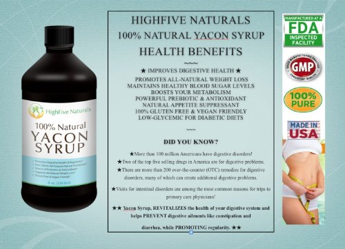 -. Feature : ★ During a Controlled Yacon Syrup 4-Week Test, Positive and Promising Results were Achieved: 73% of the subjects lost weight, (average weight loss was 2.9 pounds) with an average reduction of 1.9 inches in waist size! The results also showed a dramatic drop in bad cholesterol (LDL). Called the "Jewel of the Andes," Ancient Incas used to eat the roots for endurance, to boost the immune system and to keep from getting thirsty. / ★★ DID YOU KNOW that more than 100 million Americans have digestive disorders? That two of the top five selling drugs in America are for digestive problems. That there are more than 200 over-the-counter (OTC) remedies for digestive disorders, many of which can create additional digestive problems, AND visits for intestinal disorders are among the most common reasons for trips to primary care physicians! BUT there is good news! 100% Natural Yacon Syrup, revitalizes the health of your digestive system and helps prevent digestive ailments like constipation and diarrhea, while promoting regularity. Clinically proven to support healthy blood sugar levels and boost the metabolism. With only 7 calories per teaspoon, and a glycemic index value 100 times less than glucose, Yacon Syrup is safe for diabetics - say good-bye to blood sugar spikes and "sugar crashes!" Great for anyone wanting to rid their diet of sugar and calories. / ★ CONTINUED DAILY USE of Yacon Syrup (just 1 tsp with each meal), has been shown to have a positive effect on weight loss and intestinal health. Yacon Syrup is a potent prebiotic which helps increase the levels of healthy bacteria and flora within the intestines. This not only helps improve digestion, but also helps prevent certain types of colon maladies. 100% Natural Yacon Syrup is an excellent appetite suppressant that increases the metabolism, for optimal weight loss, and aids with cleansing the digestive system. / ★ HIGH IN HEALTHY SOLUBLE DIETARY FIBRE, it helps you feel full and is recommended to help with indigestion and irregular or painful movements. THERE ARE MANY HEALTH BENEFITS OF YACON SYRUP and it is gaining attention in North America at just the right time. ☆ Our society is suffering from an EPIDEMIC OF OBESITY, which often leads to type II diabetes. Yacon seems to be the ideal sweetener, "tailor-made" for today's age, because it offers the rich sweetness of other sugars, without the un-healthy calories and dangerous weight gain! ☆ / ★ SO MANY USES! 100% Natural Yacon Syrup (also known as the Peruvian Ground Apple) has a delicious, rich and deep flavour comparable to that of honey, figs, molasses and raisins. Goes great on cereal, oatmeal, pancakes, and yogurt. Try in Smoothies and to sweeten hot drinks, and in salads and other recipes. Use as a glaze and topping on meats, veggies and even popcorn! Yacon Syrup is perfect as a healthy sugar substitute for your favourite dish or recipe, and in cooking and baking; especially for diabetic, vegan, and gluten-free diets. It's a super-healthy, all-natural sweetener that can also be used on its own. A MUST for every kitchen! Manufactured in the USA, in a GMP, FDA inspected and approved facility - Satisfaction Guaranteed! ENJOY!
