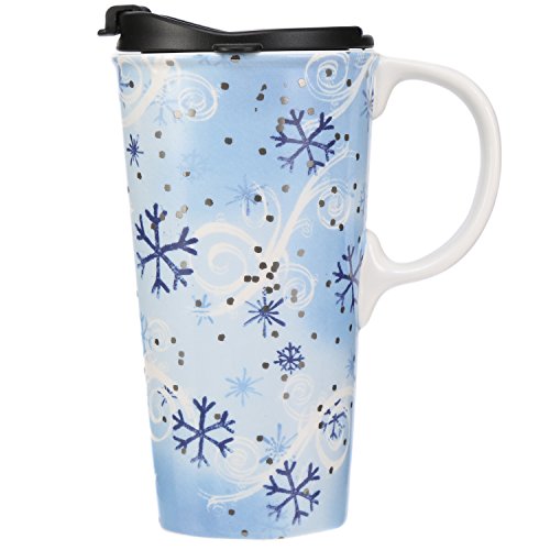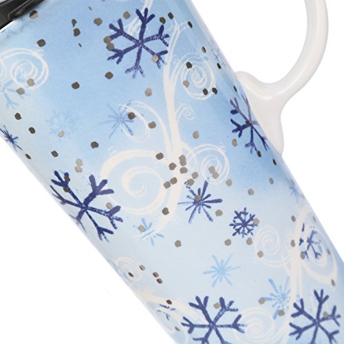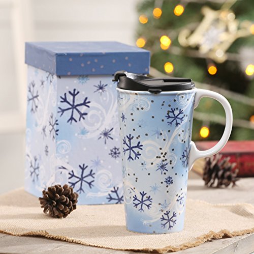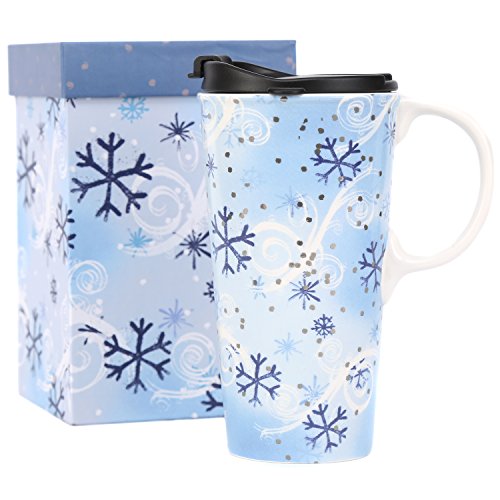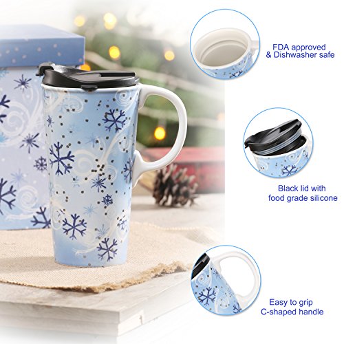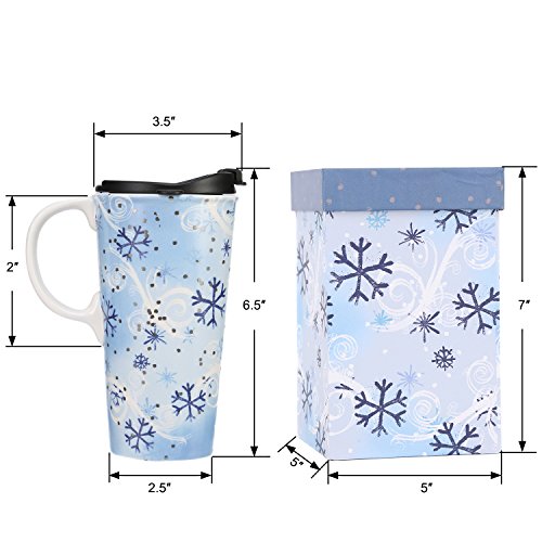 Travel Coffee Ceramic Mug Porcelain Latte Tea Cup With Lid in Gift Box 17oz. Snow Flake Flower by CYPRESS, Blue
