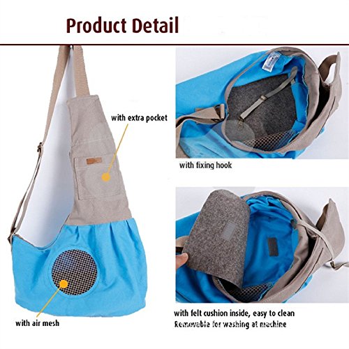 -. Feature : 4 colors for your choice , includes pink, blue , green and brown. Used for both small puppy and cat which under 8lb weight / Made of cotton material, light weight and comfortable to touch pet directly, puppy or cat won't be indisposed when stay inside / For the outside of bag, there are air mesh design and the extra pocket. Your pet can breathe well and watch the outside situation via this air meash. And you can put your phone or wallet into the pocket / For the inner of bag, there is fixing hook to stable puppy or cat well even if in running. And to comfort your pet we placed felt cushion inside, not only soft but also removable for washing by hand or machine / Exquisite workmanship and good design, make the long time pet carrring avalable