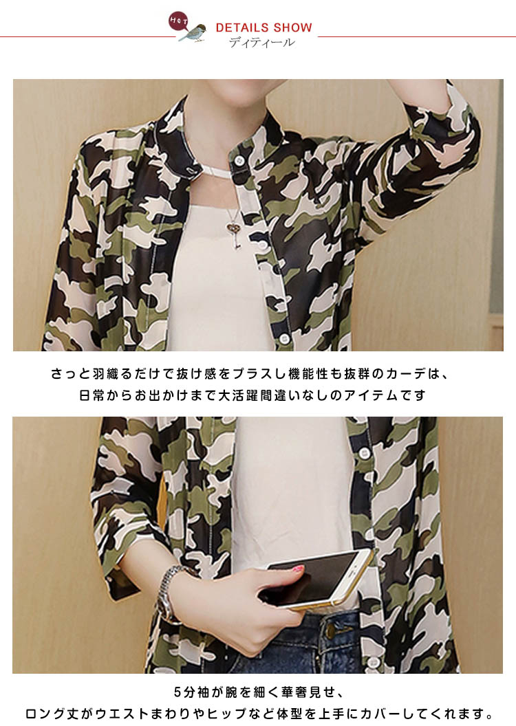 | サッと羽織るだけでUVカット!人気のカーディガンにお尻をすっぽり隠してくれるロングタイプが登場♪シンプルなデザインだからコーディネートしやすく、薄手のシフォン素材&軽量で持ち歩きもラクラクなので冷房対策にもお勧め♪ | |