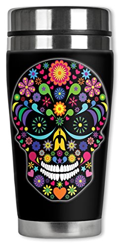 Mugzie 950-MAX "Multi Color Sugar Skull" Stainless Steel Travel Mug with Insulated Wetsuit Cover, 20 oz, Black