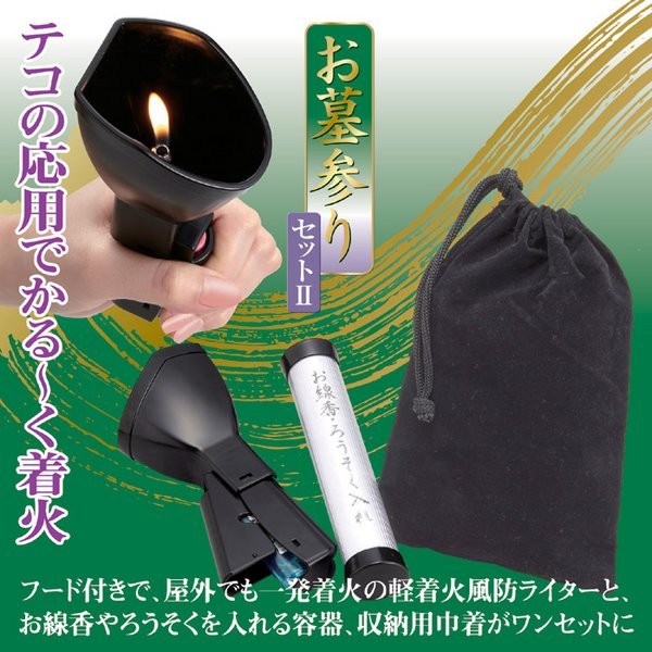 【商品名】 お墓参りセット 【風防ライター補助具/巾着袋/お線香・ろうそく入れ】 日本製 (仏事用具) 【ジャンル・特徴】 軽い力で点火できる線香着火器入りお墓参り道具セット 軽~い力で着火できる風よけフード付きのライター補助具セットです。市販の着火ライターは、近頃では子供のいたずら防止のために、着火ボタンが重い構造になってます。力の弱い人なら着火が難しいのが現状。本品は、これは「とても着火なんてできない」という方のために作られた商品です。着火はレバー部分を握るだけ。テコの原理を応用した構造になってます。風防は取り外しも可能です。お墓参りに便利なお線香やろうそくが入るケースと巾着袋のセットです。■商品スペック【商品名】お墓参りセット 【サイズ】風防ライター補助具/約7.5×5.5×16.5cm巾着袋/約14×21.5cmお線香・ろうそく入れ/約直径3.5×15cm 【重量】風防ライター補助具/約57g巾着袋/約10gお線香・ろうそく入れ/約24g 【材質】フード/PC樹脂 着火レバー:ABS樹脂巾着袋/レーヨン(表地)・ポリエステル(裏地)お線香・ろうそく入れ/PC樹脂 【セット