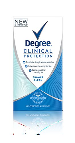 Habits & attitude data shows that 'underarm wetness is preceived to be a moderate or big problem for 27% of men and 21% of women'. 22% of men & 19% of women say they need more protection than the average person. Degree Clinical Protection is formulated with innovative TRIsolid body responsive technology which contains three important components: Unbeatable clinically proven protection without a prescription; Patented encapsulated fragrance technology; Unique skin moisturizing ingredient, clinically proven to reduce skin irritation.Feature