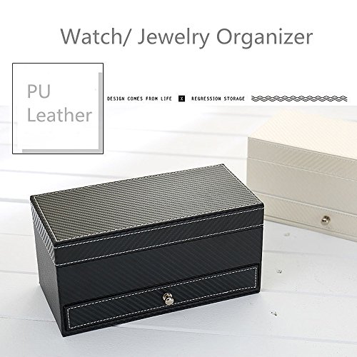 -. Feature : ①HIGH GRADE MATERIAL&WORKMANSHIP - Elegant Watch Box made of quality Black PU Leather and Soft Velvet, completely protects your beloved watch/ jewelry from scratch and damage; Greatly help to keep your accessories on the pads to avoid getting loose, minimize scratches during the usage. / ②JEWELRY WATCH BOX - 4 Slots Watch Box + 1 Jewelry Tray, can display 4 watches, at the same time, make more convenient to hold your necklaces, earrings, rings, bracelets etc...Efficient to save your space and time. NEVER MISS. / ③WATCH BOX SIZE - 8.77*4.21*4.33inch (22.3x 10.7 x 11CM); Watch Pillow: 3.5*2*1.5inch / ④IDEA GIFT - With elegant appearance and considerate design for Men & Women, this Watch Case is great for personal use, shop display and home decoration.Home Decorations as well as Commercial Use; Business/ Birthday Gifts, Makes a great gift for a father, boyfriend , husband, son, boss, friend or any other watches lovers in your life. / ⑤WE PASUTEWEL'S SERVICE - If you have any questions about this product, you can contact us by email and we will answer you within 24 hours. If the purchase has some quality defect, Pasutewel offers a 30 day money back guarantee. You can buy it freely, ENJOY YOUR SHOPPING!!!