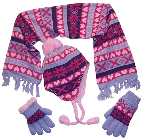 Binding : Apparel Product Description N'Ice Caps girls print jacquard knitted hat/scarf/mitten set with designs. Designs with either snowflakes or zig zag print. Full soft sherpa lining in hat and gloves, scarf is double layered and has fringes. Hard to find product, great quality and design. 3 Color options available: black/neon pink/purple/turquoise; pink/lavender/fuchsia/dark purple; turq/black/purple/fuchsia/multi. Sizes: One size fits 8-12 years. N'Ice Caps specialized design and construction. Designed in the USA. This product has been tested and approved as per CPSIA standards. 0