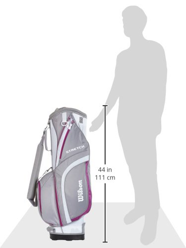 Lieferumfang: 1x Wilson Cartbag Stretch XL mit 9 Golfschlagern (Damen, rechte Hand): Driver, Holz 5, Hybrid 6, Eisen 7,8,9, Pitchingwedge, Sandwedge, Putter, Gesamtgewicht: 4,99 kg, Masse (LxBxH): 109 x 23 x 23 cm, Weiss/Grau/Violett, WGG157554