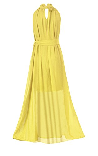 Maxi dress featuring sleeveless, ruffle neck, covered with a ribbon at waist