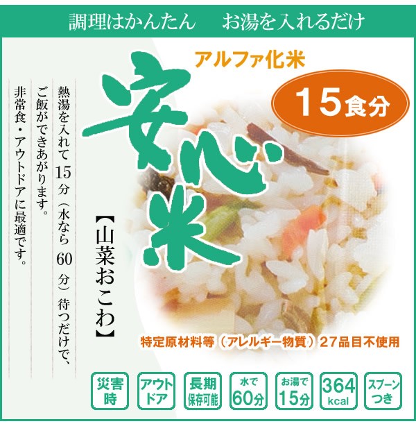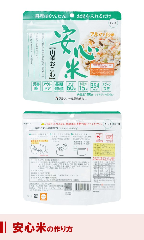 | 原材料 | 名称:アルファ化米飯(山菜おこわ) もち米(国産)、味付乾燥具材(水煮たけのこ、デキストリン、乾燥にんじん、水煮ぜんまい、水にわらび、乾燥きくらげ、風味調味料、魚介エキス、還元水あめ、かつお調味粉末、食塩、こんぶエキス、本みりん)、調味料(アミノ酸等)、酸化防止剤(ビタミンE) |