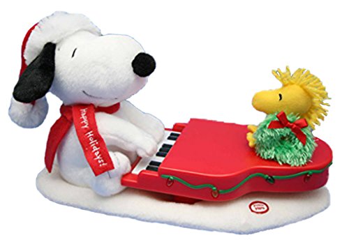 -. Feature : 2009 Hallmark / "Swinging With Snoopy" / Snoopy and Woodstock at the piano, with light, motion, and sound. Snoopy sits at the keyboard, with a Happy Holidays scarf and a red cap; Woodstock holds a wreath with a red ribbon atop the rear of the piano. The tag says: "Press the button to hear Snoopy play jazzy renditions of three holiday favorites: Linus and Lucy, Deck the Halls, and O Christmas Tree. Each time you press the button, Snoopy will move side to side and you'll hear a different song while the lights on the piano blink in time to the music!"