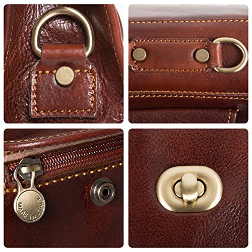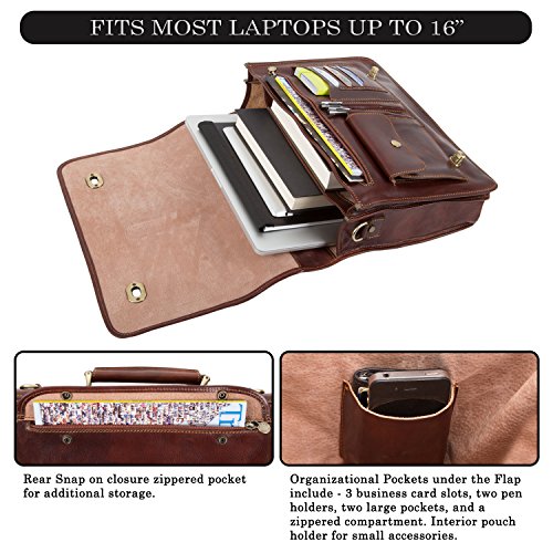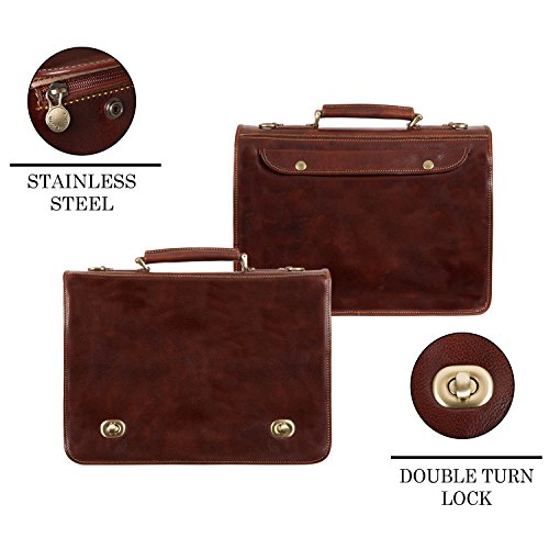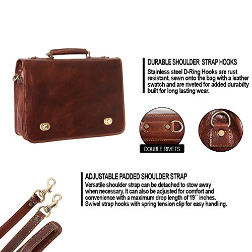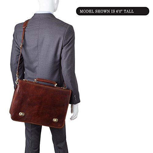 Studio : Luggage Depot USA, LLC Publisher : Luggage Depot USA, LLC Binding : Apparel Product Description Alberto Bellocchi Milano. Handmade in Italy - Top Grain Calf Skin Leather - Exceptional Artisan Quality. Each of our products is handmade in the Florence region of Italy, using top grain calfskin leather that has been carefully selected for durability, appearance, and quality. The leather is vegetable tanned using natural oils and dyes, mixing old world techniques and recipes with new age technology. Vegetable-tanning is an eco-friendly approach to producing quality leather that is conscious of the production cycle and makes every effort to respect the environment, uses natural resources such as tannin from trees and various vegetables, and is the most traditional, respected, and recognizable form of tanning techniques used in Italy. This process allows the leather finish to have a beautiful warm shade color while still revealing the natural look and feel of the top grain hide. The leather matures without ruining, developing a charming and appealing patina that gets more vivid with time without compromising the strength and resistance of the hide. The vegetable-tanned oils and dyes also make the surface of the leather smooth and flexible, as well as easy to clear away any scuffs, scratches, or marks by coating them with the same patina when polished with a towel or any leather conditioning or cleaning solution. We hope you will enjoy this timeless piece of Italian tradition and craftsmanship. 100% New Handmade Italian Calf-skin Leather, Interior Suede Lining, Stainless Steel Rust Resistant Hardware, Double Compartment, Flap over with double knob closure, 2 Pen Holders, 3 Business Card Slots, Large Snap Pouch, Exterior zippered compartments, Fits Laptops up to 16" screen size, Adjustable and Detachable Shoulder Strap: 0.75" wide and 19" Strap drop length. 0