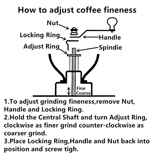 1. To adjust grinding fineness,remove Nut, Handle and Locking Ring.